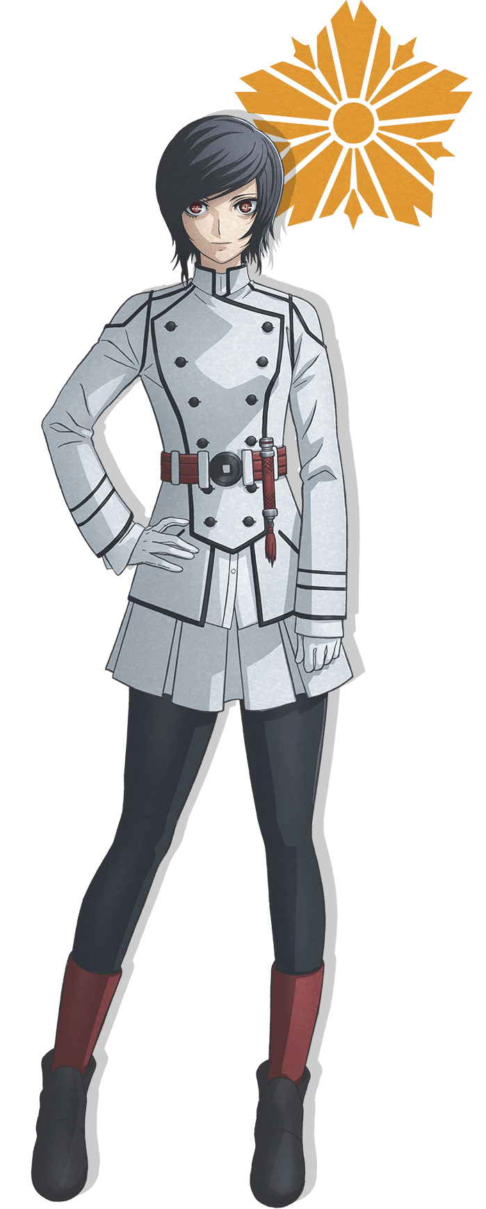The Apprentice wears a white military uniform with a skirt, black tights, red socks and black boots. She has short black hair and red eyes. She also has an energy sword which she carries on a red belt.
